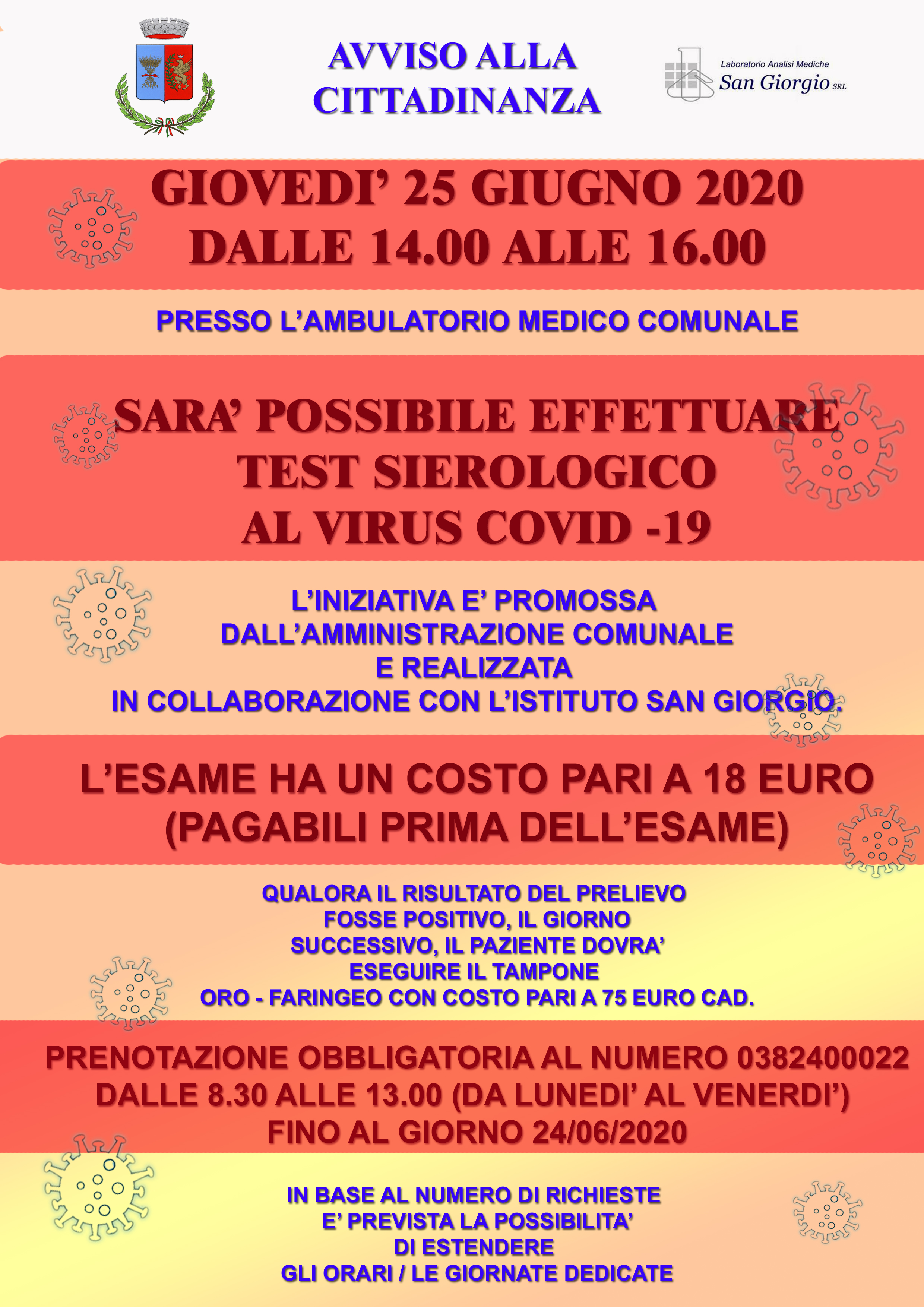 Si comunica che Giovedì 25 giugno 2020, dalle ore 14:00 alle ore 16:00, presso gli ambulatori medici comunali, sarà possibile effettuare, su base volontaria, il test sierologico al virus Covid-19.