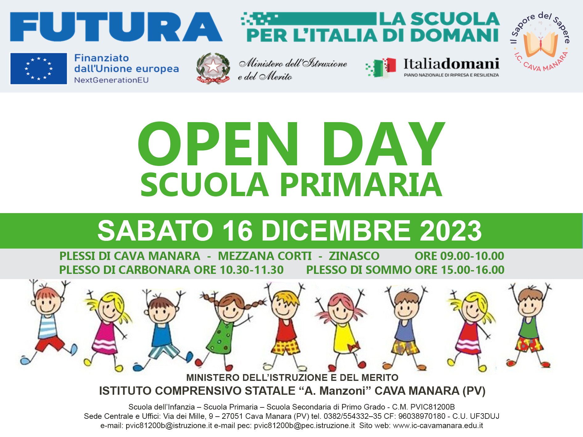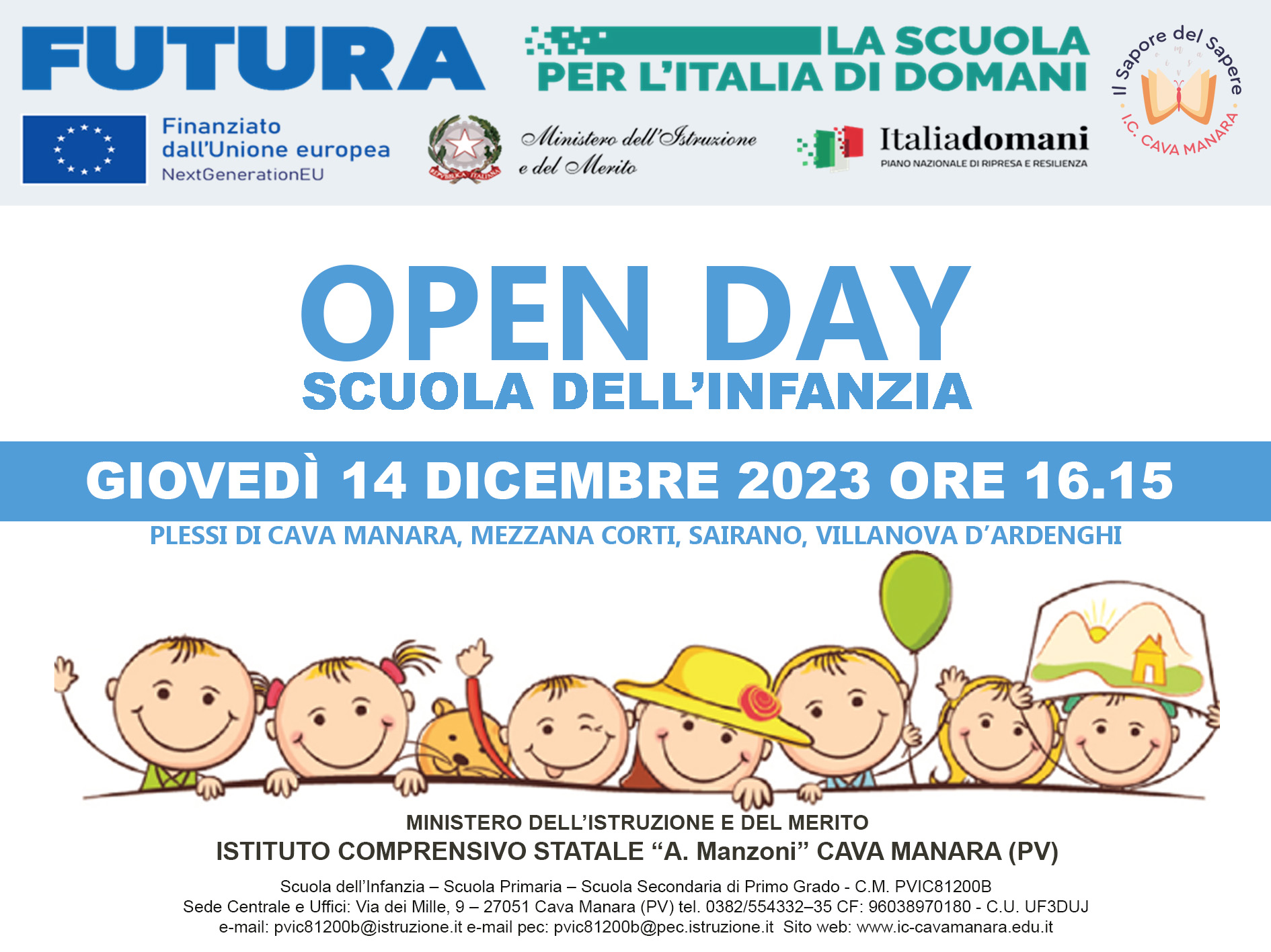 Avvisiamo che giovedì 14 Dicembre 2023 dalle ore 16.15 alle ore 18.15 i genitori dei bambini nati dal 1 gennaio al 31 dicembre 2021 residenti nelle zone di Cava Manara/Zinasco /Sommo/Mezzana Rabattone/ Carbonara al Ticino/Villanova d’Ardenghi, potranno recarsi presso la scuola, dove i docenti incaricati illustreranno i punti all’ordine del giorno: