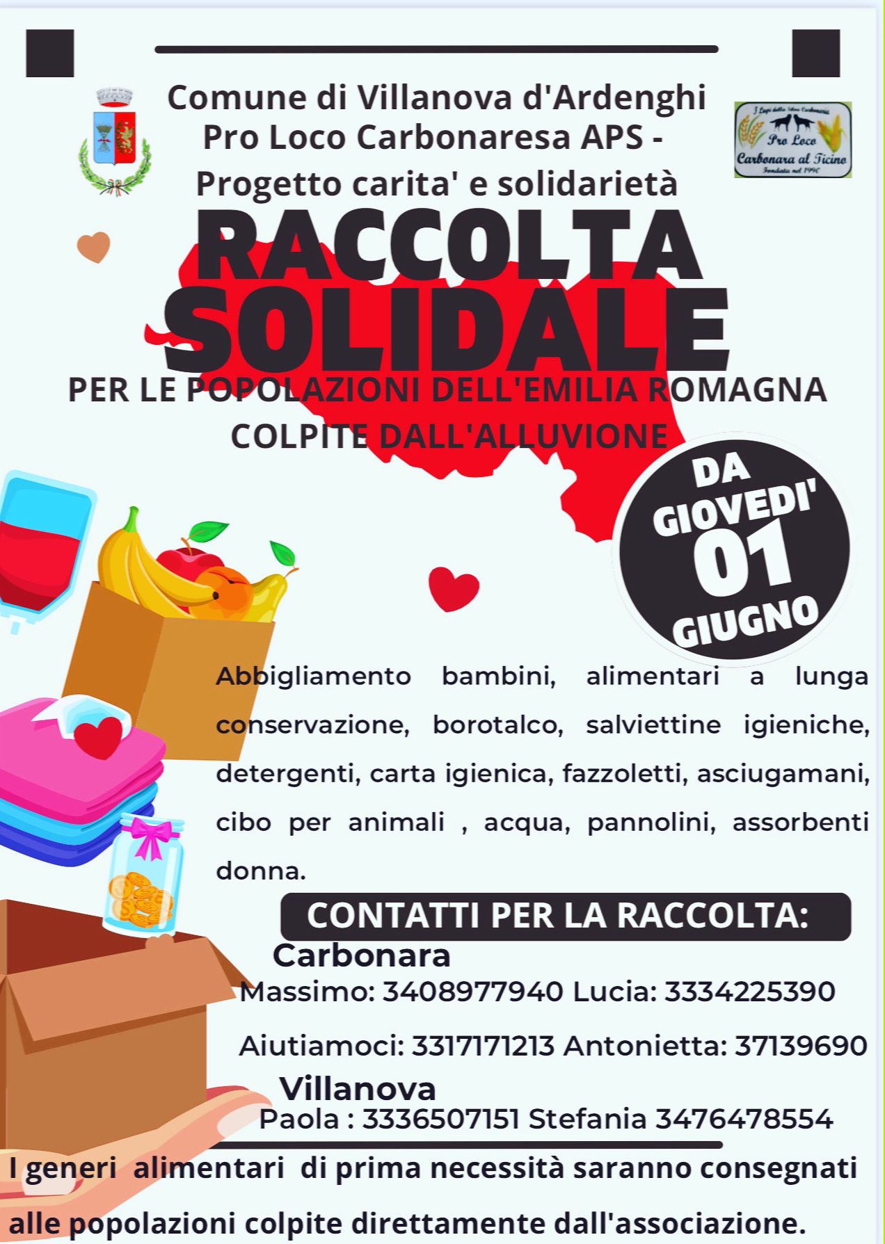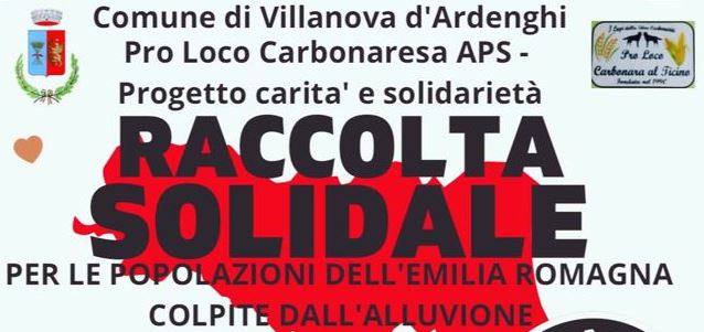 Avvisiamo la cittadinanza che il Comune di Villanova d'Ardenghi in collaborazione con la Pro Loco Carbonarese ha organizzato una raccolta solidale per le popolazioni dell'Emilia Romagna colpite dall'alluvione.
