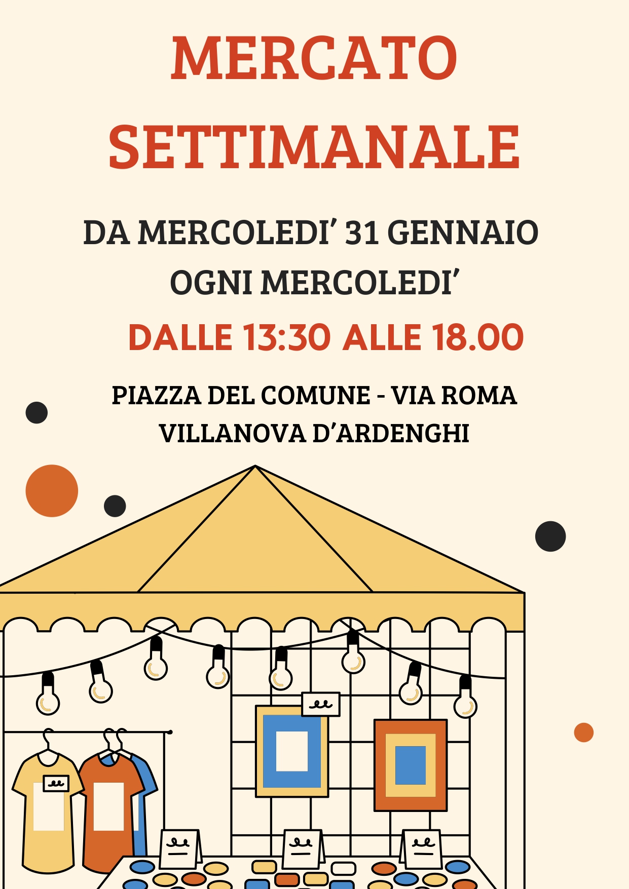 Avvisiamo la cittadinanza che il mercato settimanale, presso la piazza del comune in Via Roma, sarà disponibile dalle ore 13:30 alle 18:00 ogni mercoledì da mercoledì 31 gennaio.